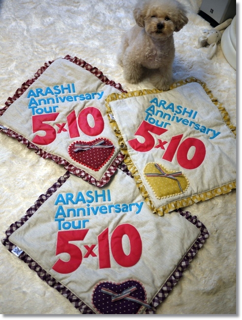 まー言うまでもありませんが、私が作ったわけではありません^^;良子さんのお友達に「こんな感じで~」って大雑把なイメージを伝えたら、文字のところにステッチを入れてくださったり、バックの角がまーるかったのをうまく四角になおしてくださったり、ちゃんと嵐さんマークも生かしてくださったり・・・と、想像以上に素敵に仕上げてくださって大感謝です